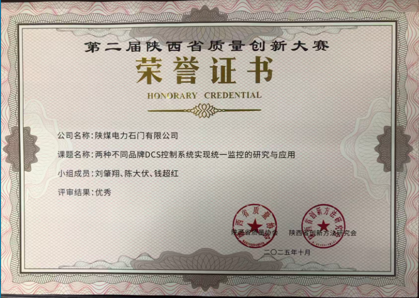 近日,在第二屆陜西省質量創新大賽中,陜煤電力石門有限公司申報《兩種不同品牌DCS控制系統實現統一監控的研究與應用》榮獲優秀獎?!?..